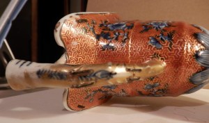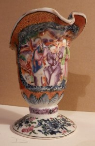 The classic Rose Medallion decoration usually includes a number of panels painted (depending on the size and shape of the piece) with depictions of people, birds, and flowers. The predominant colours being green, pink, blue, yellow, black, and gilt. You, of course, will notice that my piece was broken and has been repaired. Repairs were once done quite differently than today with our modern adhesives.