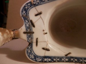 This type of repair looks, to our eyes, quite crude but by doing it this way it ensured that the repaired crockery would withstand the regular cycle of use and washing up required by any item of tableware in the kitchen.