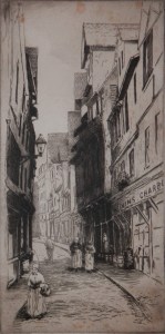 In my collection is an etching which is today’s subject. The etching itself is a fine impression of a 19th century street scene. It is most likely a Dutch or Belgium city.