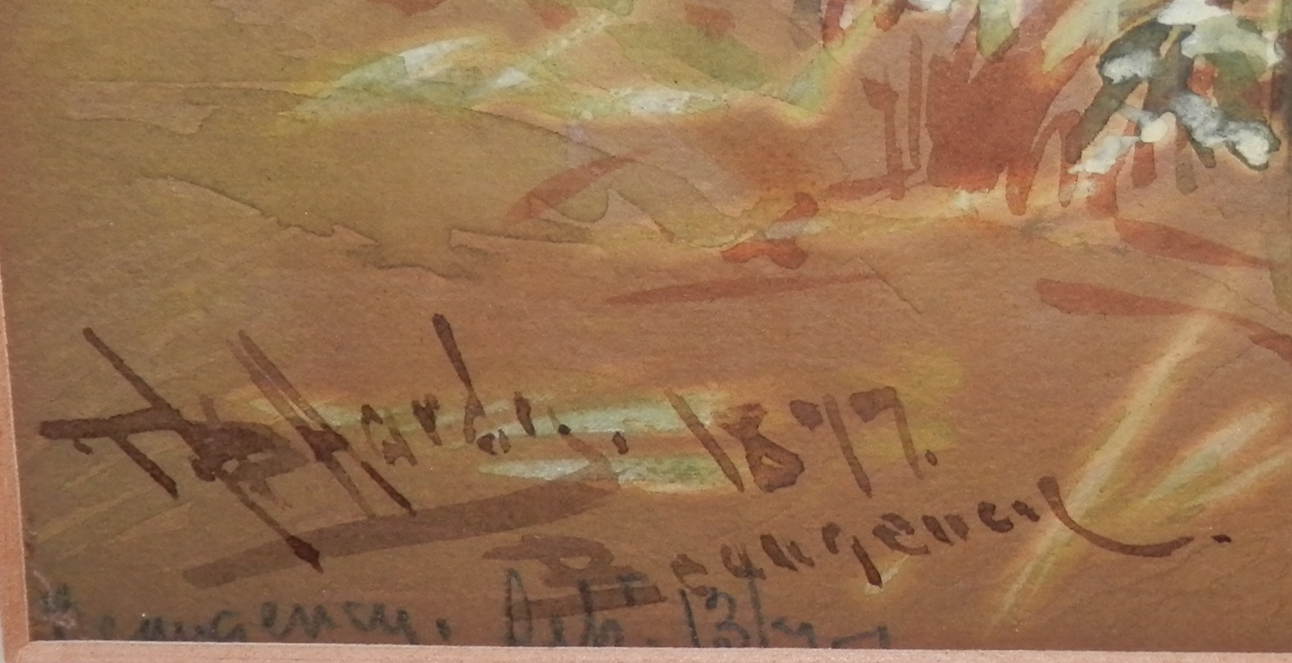 The watercolour is signed, titled, and dated on the lower left and here we will take note of the year in which this was painted. It reads 1897. This might have been the last work which Hardy created since he died in 1897.