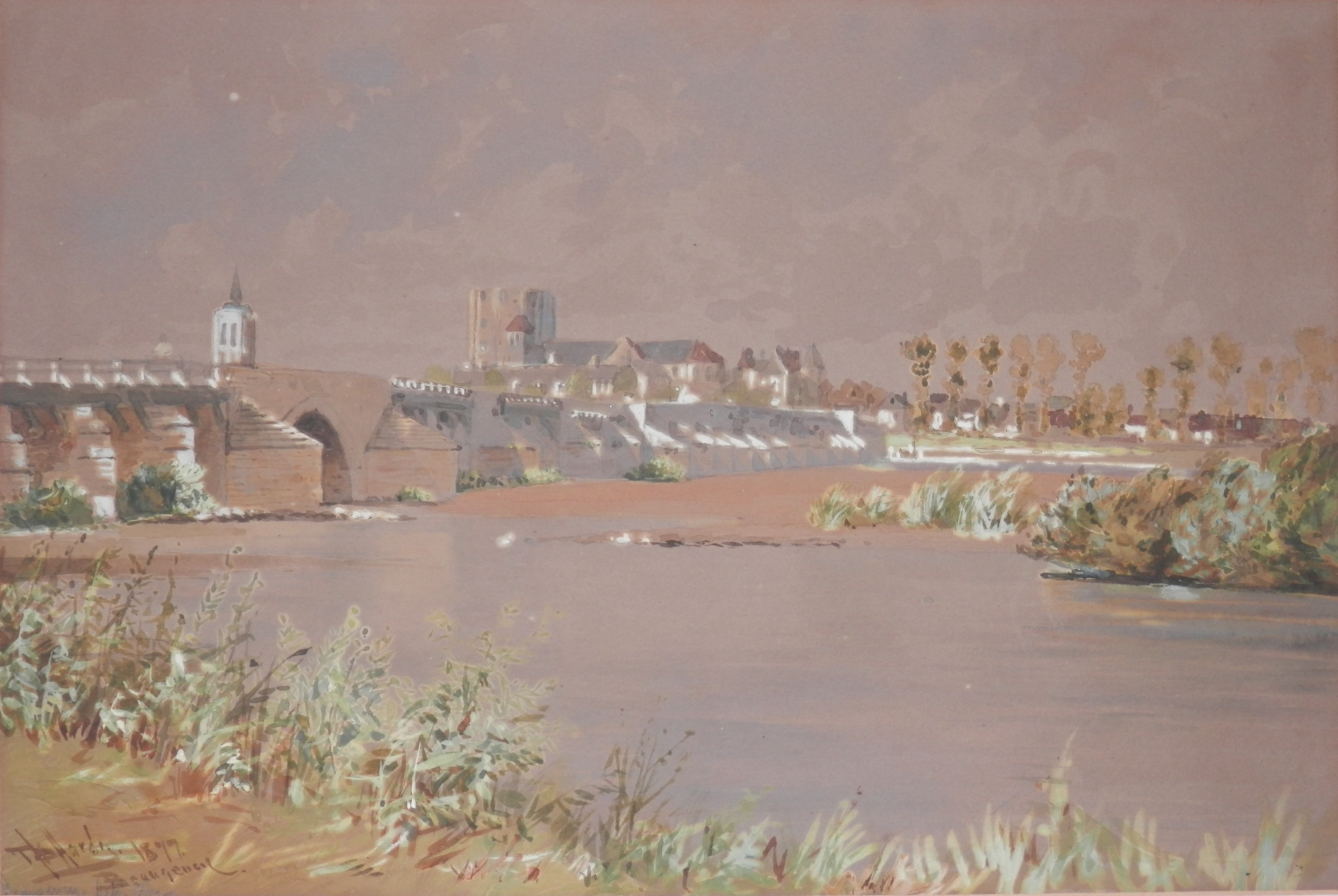 The watercolour in my collection has little to do as a marine painting. It is a view of Beaugency in the Loire Valley in France and hence the water in the image is the Loire River. We stand on the river bank and look along the 12th century stone bridge (it has 26 arches) toward the village. We see the tower of the Eglise Norte Dame and the Tower of Caesar, Place Dunois. The four bells of Saint-Fermin bell tower play the Orleans, Beaugency, Norte-Dame de Clery, Vendome. A tune you will be whistling soon after your arrival here.