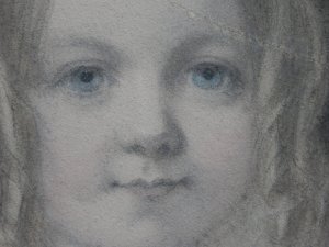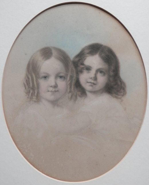 The portrait is of two young people. I would guess their ages at 2 1/2 and 3 1/2 years. One positioned slightly forward of the other with the arm of the older child protectively across the breast of the younger. The portrait is unsigned and undated, no watermark or any other identifying marks can be found. From the age and browning of the paper I would suggest first half of the 19th century.