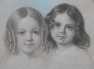 The positioning of the two young people is very reminiscent of a family portrait done in watercolour of the children of Count Wladislaw and Countess Elsbieta Krasinski. This watercolour was painted by #FranzXaverWinterhalter (Winterhalter was a very renowned portrait painter). But these are not those children. I think that these two young people are Vicky and Bertie. Queen Victoria’s two oldest children. That would date this work to 1843/44 – within my estimate for the age of the paper.
