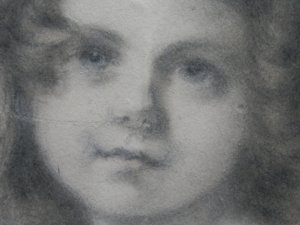 The quality of the work is evident. The subtle shading, the minimal use of colour, the white outlining of the children’s bodies only adds to the focus on the faces of the two sitters. And two very finely done faces they are.