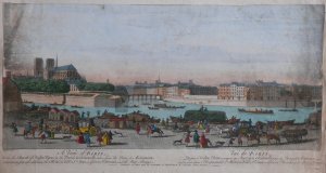 We see a scene of the river Seine as it divides to bypass the Ile de la Cite. It is considered to be the epicentre of Paris and the site of Norte-Dame Cathedral. The bridge seen connects the Ile Saint-Louis to Ile de la Cite. I am not quite sure why the horsemen are riding down the ramp into the river.