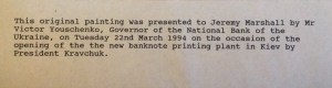 This artwork was given to him in by #VictorYushchenko in May of 1994. At that time Mr. Yushchenko was Governor of the National Bank of the Ukraine. He later became the third President of the Ukraine (2005-2010). The occasion was the opening of the new banknote printing plant in Kiev. The plant was opened by then President #LeonidKravchuk.