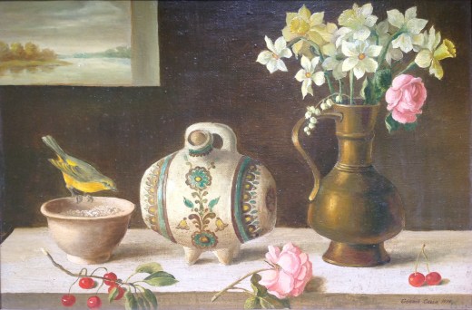 The painting is a still-life. The artwork is signed and dated 1990. The pottery in the work is certainly typical of that produced in the Ukraine. I do not know what the other symbols such as the flowers, wren and fruit mean if they are symbols at all.