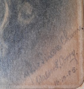 We look at a drawing by artist Walter F Corry. I have found no information in regards to this artist. The date on this piece reads as 16.10.05. From the age of the paper, I lean towards 1805 rather than 1905. I cannot say for sure, even, whether Walter Corry was the artist or this was given as a gift to s friend. The salutation is ink while the drawing is graphite.