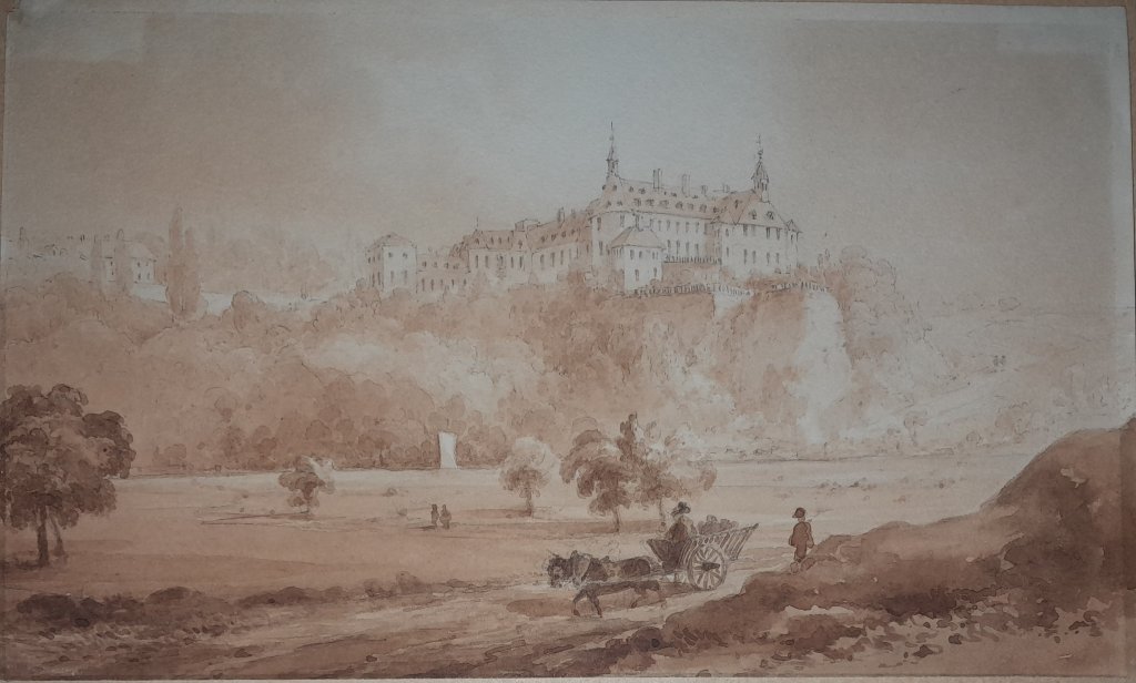 The whole image is lightly drawn in graphite and the sepia tones added to give depth and shading. This sepia wash drawing from my collection shows the palace standing tall and majestic at the rim of a promontory A river runs a the foot of this precipice although not seen. A fine home to the royal family even in exile. A finely executed drawing from history.