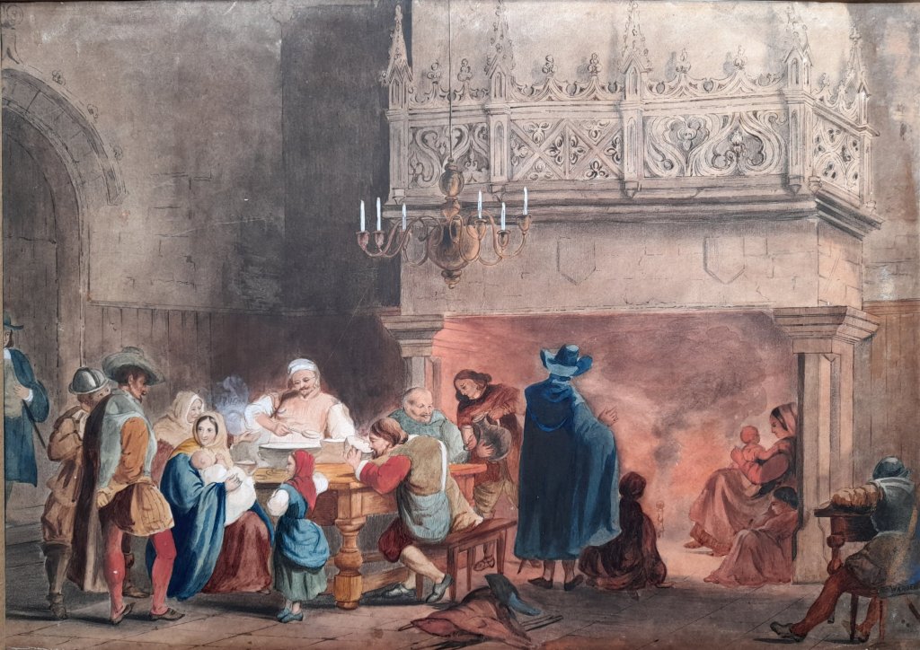 A while back, I purchased a watercolour to add to my collection. It is a scene showing a group of people crowded around a table beside a very large fireplace. The signature on the verso reads #GeorgeCattermole (1800-1868).