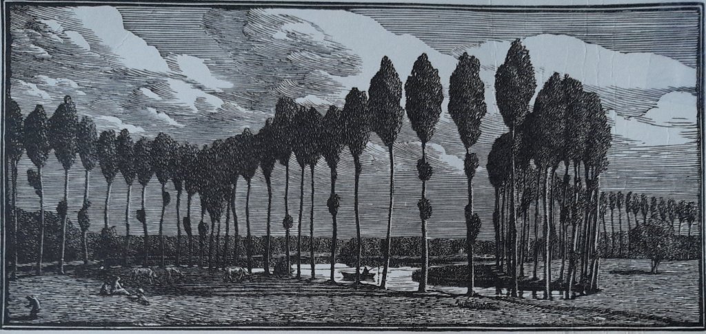 The woodcut is called #PoplarsinFrance and comes from early in her career. Her first woodcuts come from around 1905 and she soon excelled in this medium. Her formal training was done at the Slade School (1908 -1910) after which she moved (1915) along with her husband and two daughters to France. Except for 1915 to 1928, Raverat resided in or near Cambridge. She was a founding member of the Society of Wood Engravers in 1920. Raverat concentrated on scenes of rural life and landscapes. Gwendolen Marie Raverat was the granddaughter of Charles Darwin as well as being a member of the Bloomsbury Group. She was friends and acquaintance of Ralph Vaughn Williams (second cousin)¿, Vanessa Bell, Stanley Spencer, Rupert Brooke and many more well known artists.