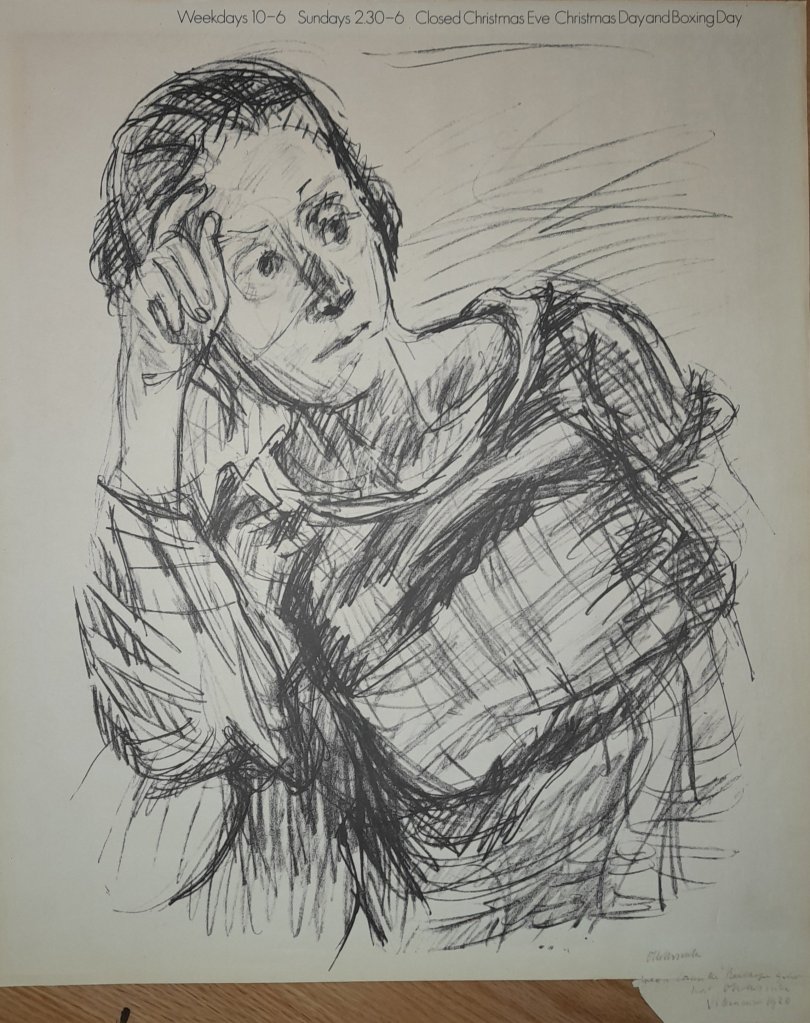 This poster was created for the Bethnal Green Museum exhibition in 1971 of Kokoschka’s works in the collection of Count Bethusy-Huc. The top of the poster has been removed down to and including the dates of the exhibition and a strip on the bottom has also been removed while retaining the message at the lower right on the print.