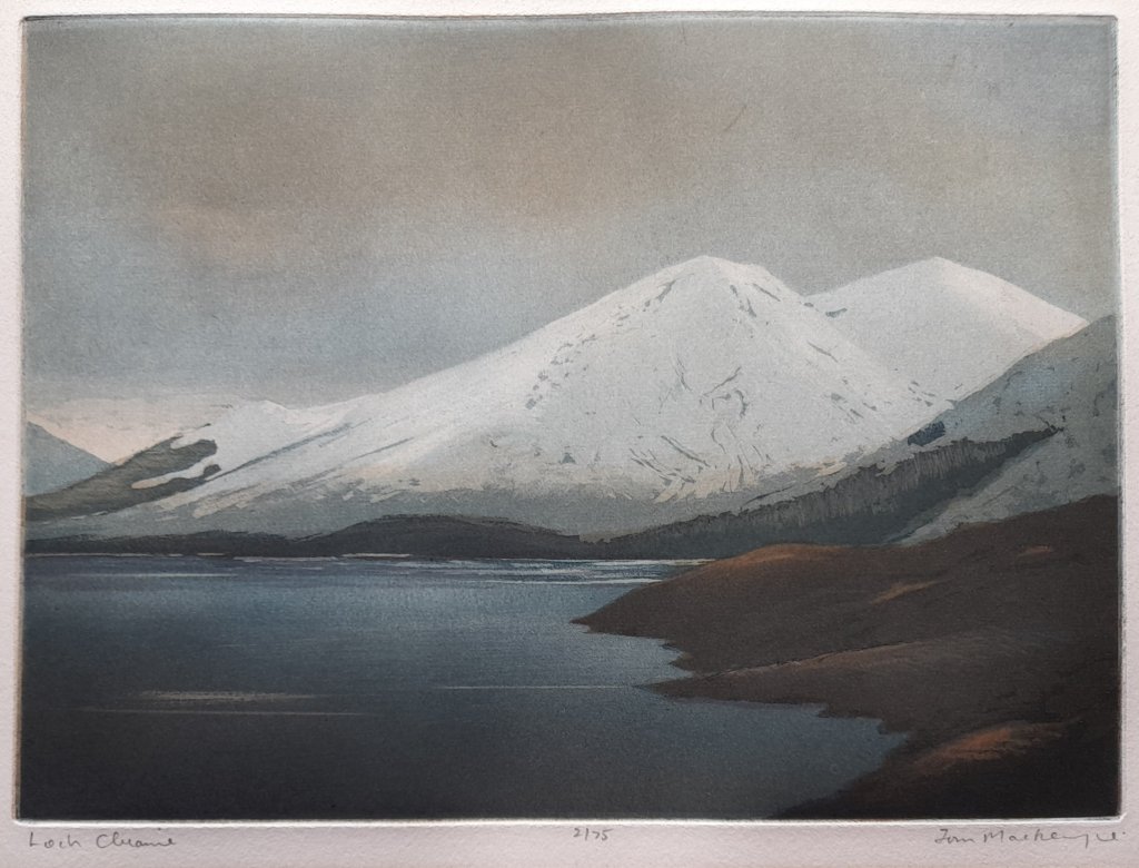 We will begin with #TomMackenzie (1947-2018). A Scottish artist who lived and worked in #Portree on the beautiful Isle of Skye. Most of his etchings portray the Isle or places on the west coast of Scotland. Generally, he used 3 plates to make his works allowing several colours to be used in each work. The simplicity which we see when we gaze on his works disguises the amazing technique and subtlety of light. He made small print runs, usually of 75 or less. My copy of #LochCluanie shows off his talent as an etcher. The grandeur of the landscape is countered by the misty, foreboding remoteness of this place to engage the viewer to look deeply into this image.