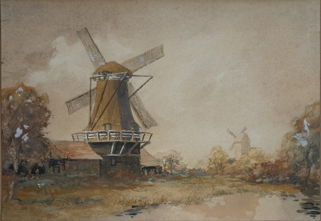 The piece,I picked up is a very fine watercolour of #DeKoopMolen in #Overijsel, Holland. The Mill was built in 1839 and was used to grind corn. One of the features, I like is the second mill in the distance. A very different style of mill. The near mill has a rotating top section allowing the sails to catch the wind while the far mill itself is set on a swivel at its base allowing the whole mill to revolve.