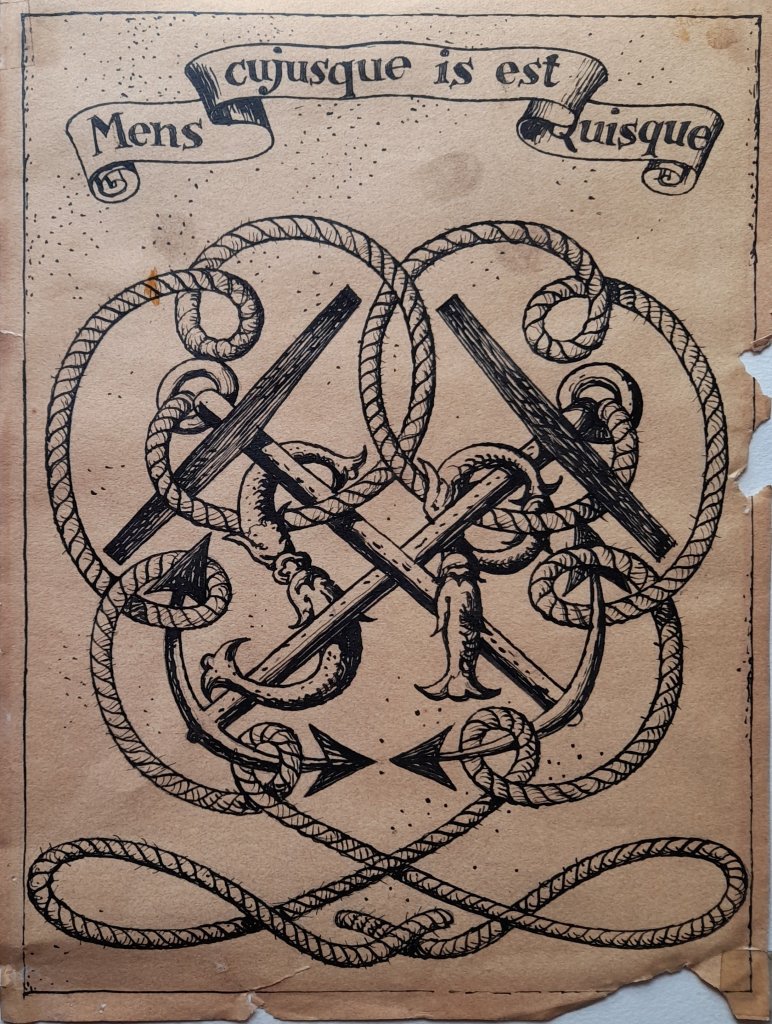 To end, I thought I’d show an old drawing I recently acquired. It displays an image with a monogram amid crossed anchors with a banner atop reading ‘Mens cujusque is est Quisque’. It translates into ‘the mind is the man’. This was the ate which #SamuelPepys put at the end od all the books in his library. A different bookplate was placed at the front of each book.