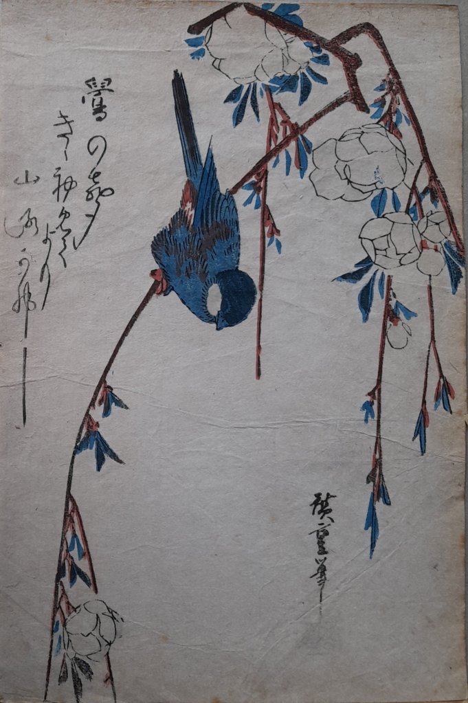 We travel back now to Japan, 1838, to artist #UtagawaHiroshige, a Japanese woodblock artist. I have mentioned works by him in previous chapters but I acquired another fine work by him. It is apiece called #WeepingCherryandBluebird. It bears the Hiroshige signature and seal (almost unreadable) as well as a poem which reads “I hear a song of a nightingale when I enter the mountain lane“. A very beautiful piece to have added to my collection.