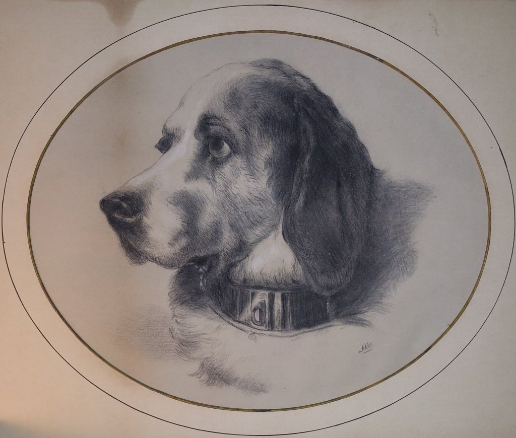A fine charcoal drawing of a bloodhound after #EdwinHenryLandseer. The dogs name was Odin. It is initialed lower right.