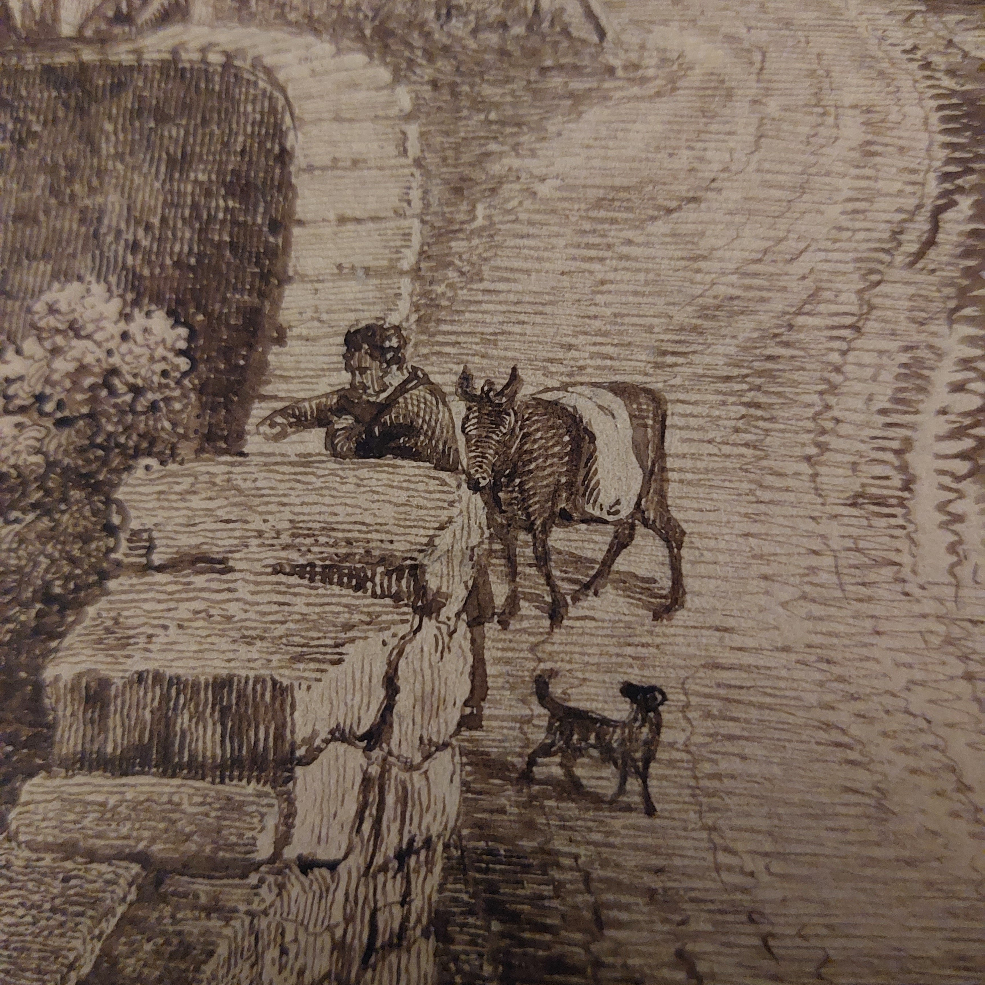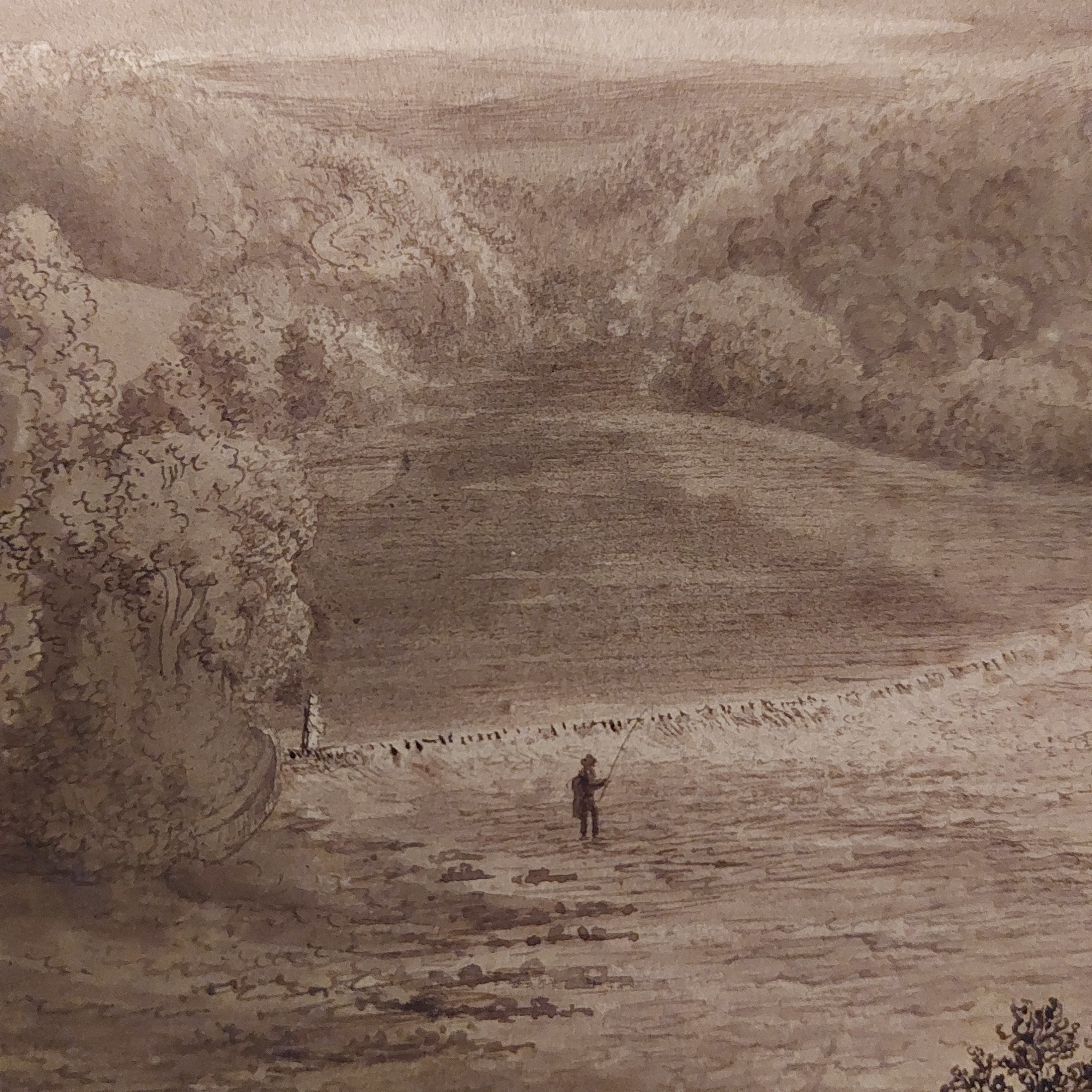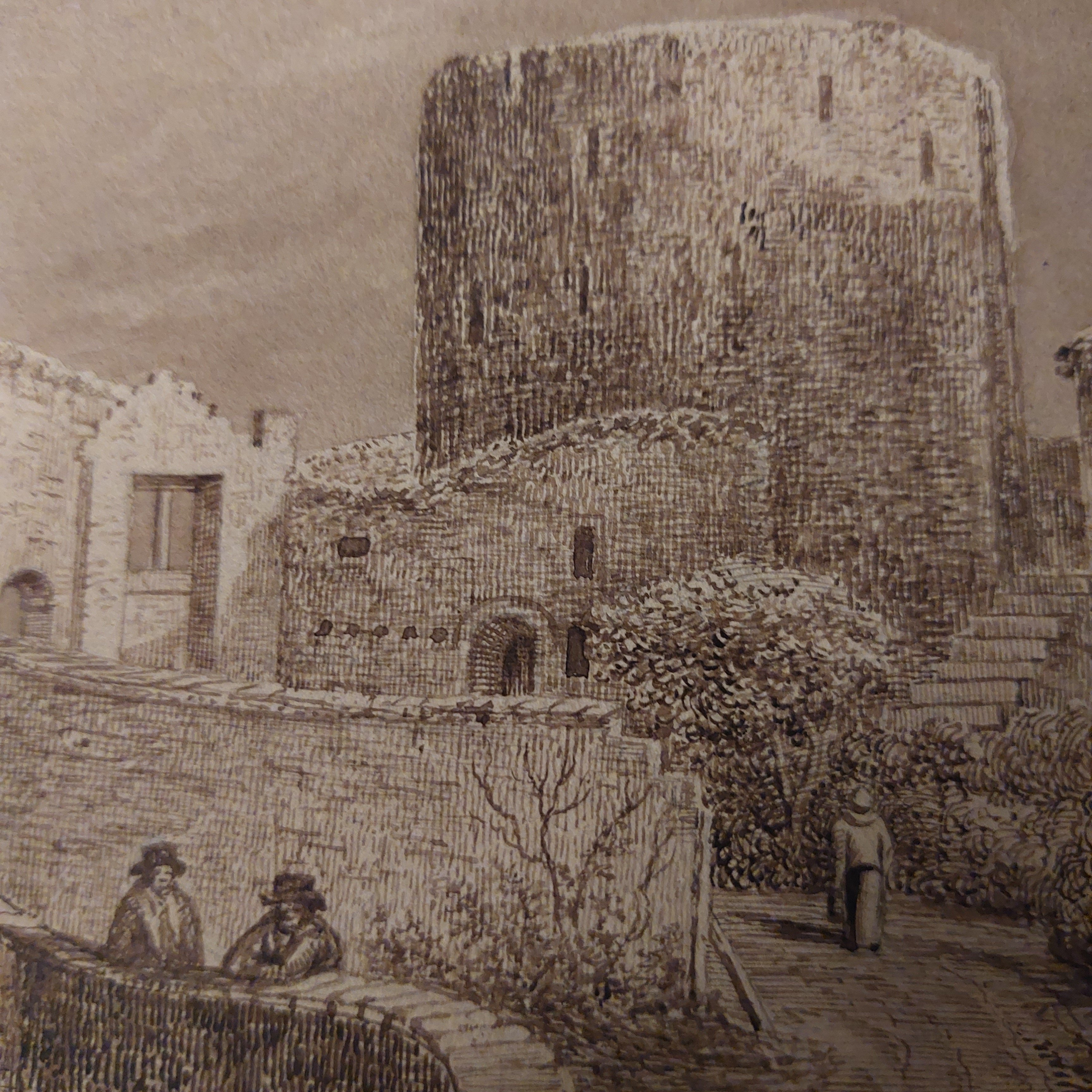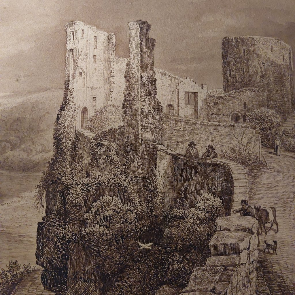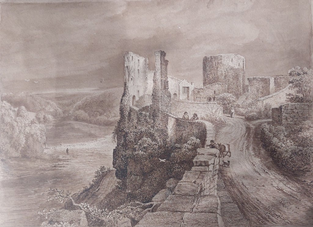 As with last week’s topic, this week’s artwork was also in the folder I bought. This extremely fine drawing is 12″ by 16″ (305mm x 405mm) and done with brown ink and wash. A monochrom since he uses only a single colour and varies only the intensity of that colour. I have found an image online of an engraving of this piece. The engraving is done by artist #GeorgeFennelRobson (1788-1833). There is also a watercolour of this scene, which is attributed to Robson, but it lacks a couple of elements that appear here in this drawing and in the engraving.