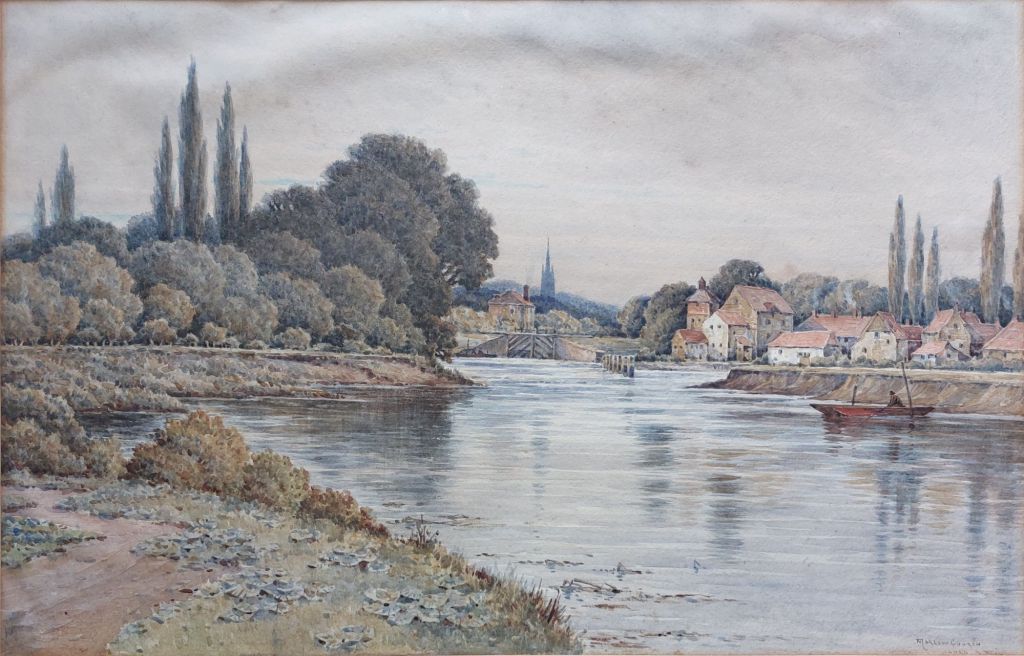 The watercolour portrays Marlow in about 1860. In the distance, we see All Saints Church with Marlow Lock in front and to the right stands Marlow Mills. The piece is signed by the signature lies mostly beneath the matte. A nice use of colours along with a good architectural eye portray Marlow as a beautiful and calm place o to live.