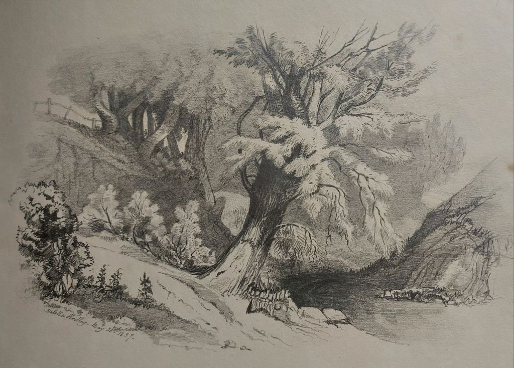 Also, in this set of drawings from 1837, there are two landscape scenes focusing on trees. These two images may be Isabella’s own works for her tutor/drawing class since I have been unable to find images of them.