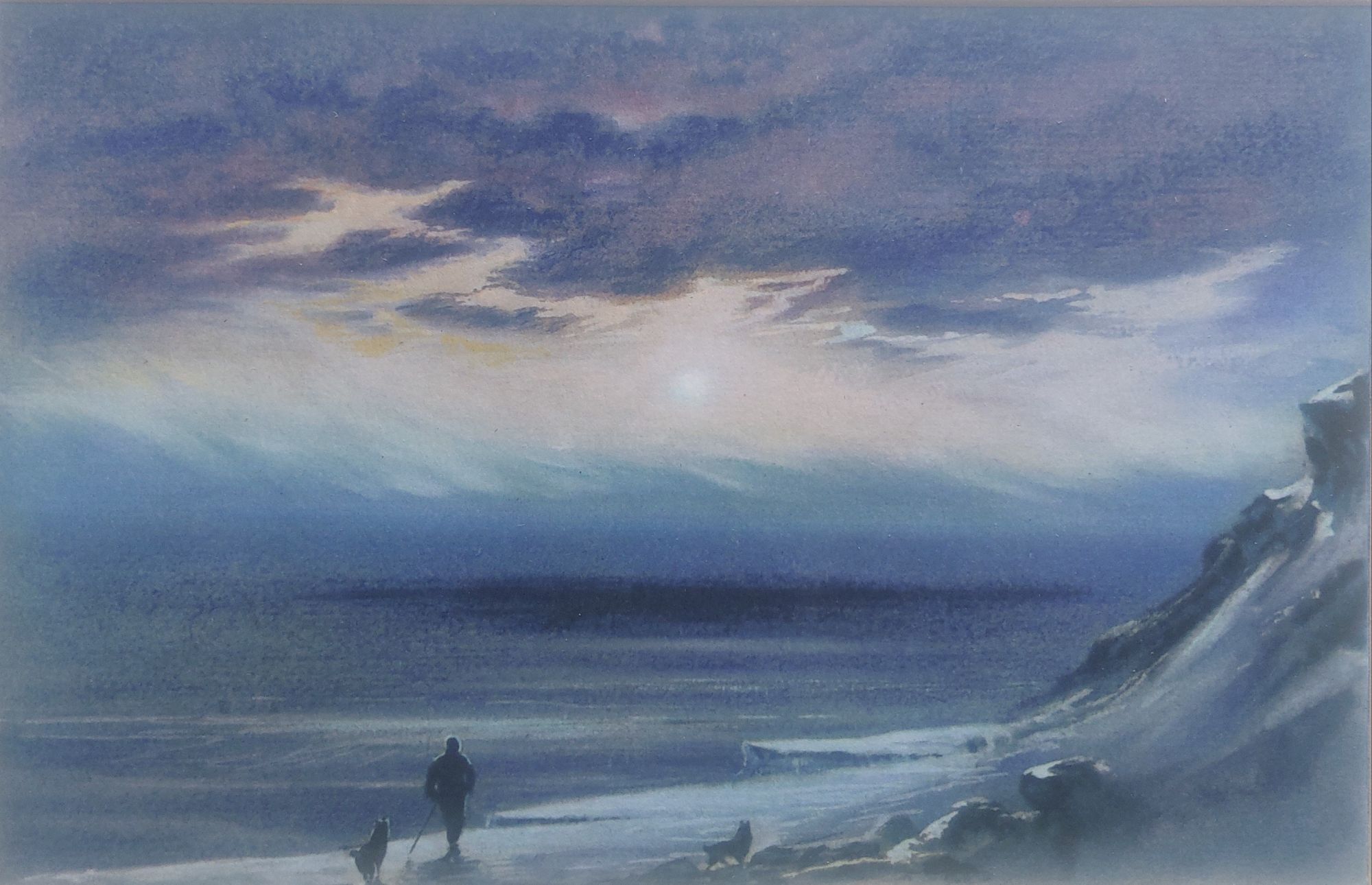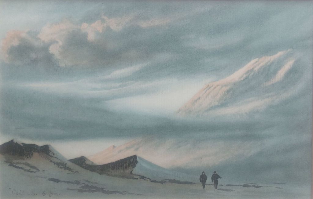 Wilson was a doctor, ornithologist, and artist. He joined Scott on the Discovery Expedition to Antarctica from 1901-1904, later returning to Antarctica on the ill-fated Terra Nova. He created watercolours, sketches, and observations that portrayed the polar environment and expedition life. Wilson sketched with pencil, notating colours for later painting. A trick he used was to add vodka to his watercolour water to keep it from freezing. He produced studies of birds and the polar environment, which later became the basis for the book Edward Wilson’s Birds of the Antarctic.