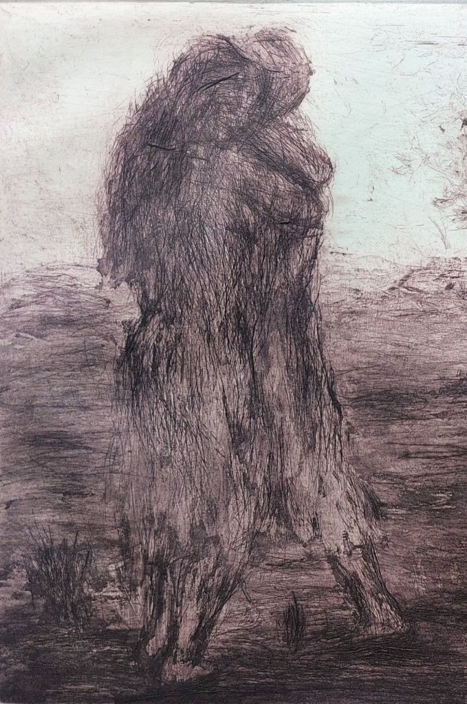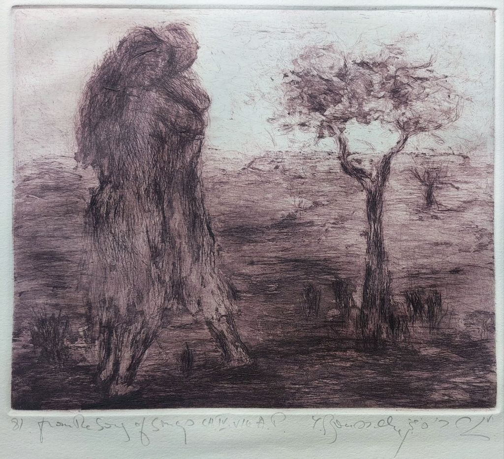 The artist is #Ya’akovBoussidan. He was born in Port Said, Egypt, in 1939. Boussidan is a painter, a sculptor, and a printmaker. When he was ten, he and his family were exiled from Egypt due to the Arab-Israeli war. Boussidan was interested in the furtherance of Jewish tradition through his art. At the mature age of 27, Ya’akov travelled to London to study printmaking at Goldsmith College. With access to presses and printing facilities, Ya’akovs’ love of the colours ‘black and white’ were brought to the fore. His technique of etching was refined, along with the mastering of mixing his own inks brought a more focused approach to displaying his thoughts. A few different shades of black can bring warmth or coolness to an image.