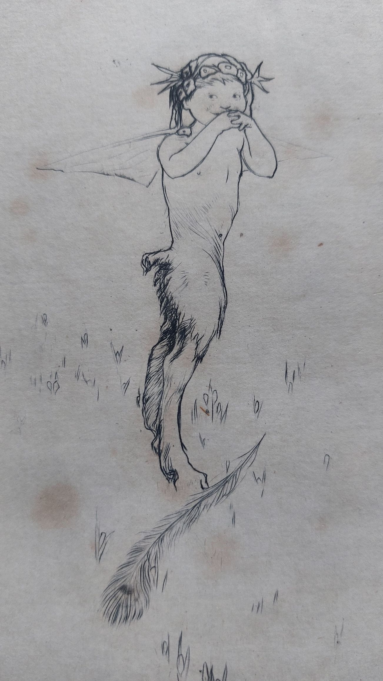 A youthful laughing faun with a large feather at his hooves shows that he has been up to mischief. A mischievous and playful piece.