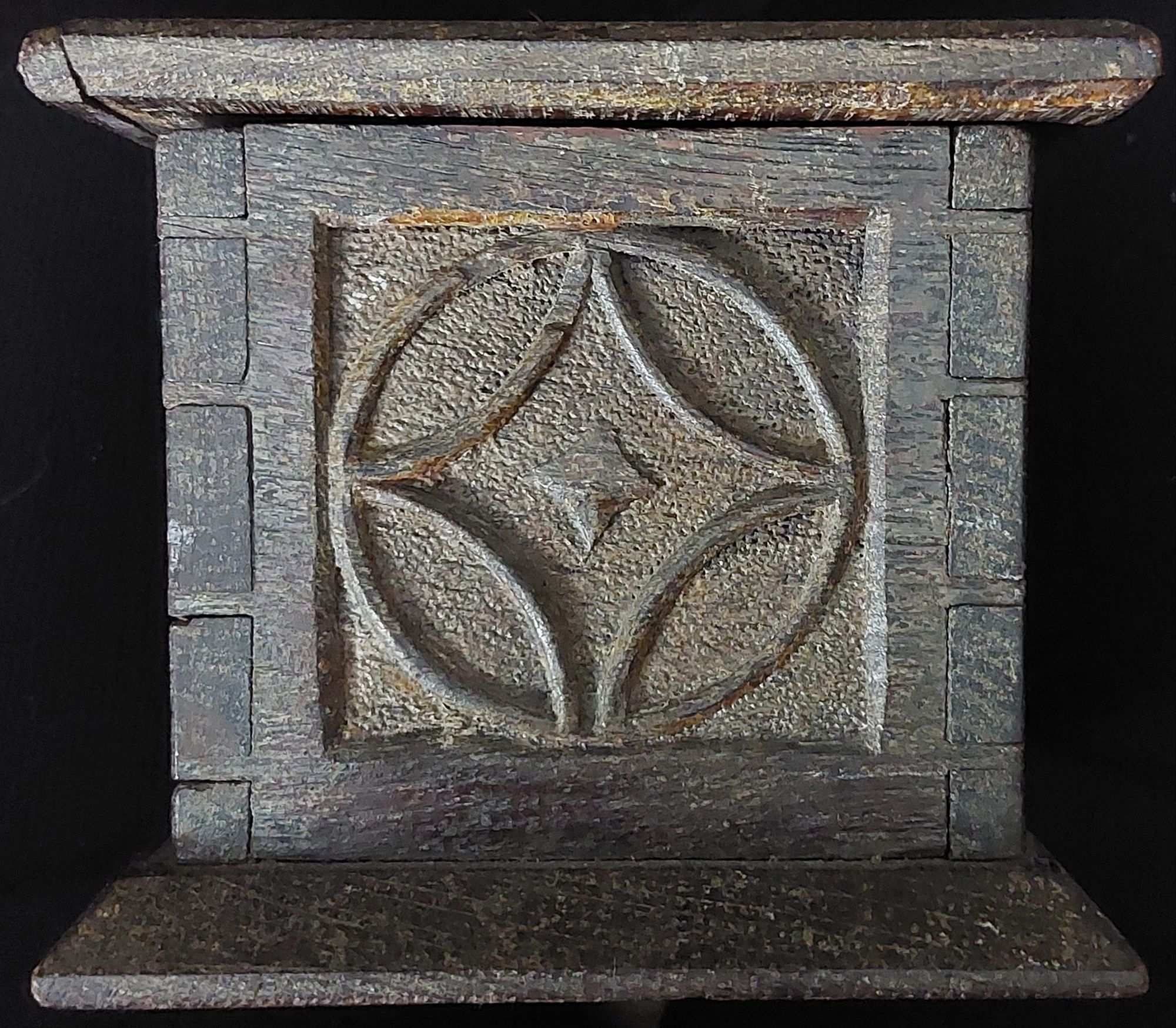 The carving on this box is wonderful because oak is quite a fine-grained hard wood and not easily carved. Geometric shapes or roundels decorate this box.