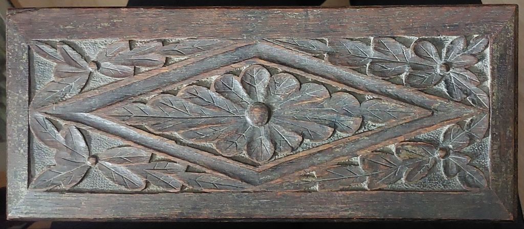 The lid is decorated with a border, a rhombus/diamond shape with central and surrounding leaf motif – possibly being oak. I thought the back panel was just plain – and looks so – but under close inspection, the design for four roundels can be seen ever so lightly scribed into the wood. It was just never carved. The box was possibly meant to hold documents/keepsakes, but I do know from smelling the interior that at some time, a gentleman has kept tobacco in this box. The measurements of the box are externally 32.5cm x 14.5cm x 12cm or 12 7/8″ x 5 3/4″ x 4 3/4″ – internally 28cm x 9cm x 9cm or 11″ x 3 1/2″ x 3 1/2″. A fascinating item to have picked up.