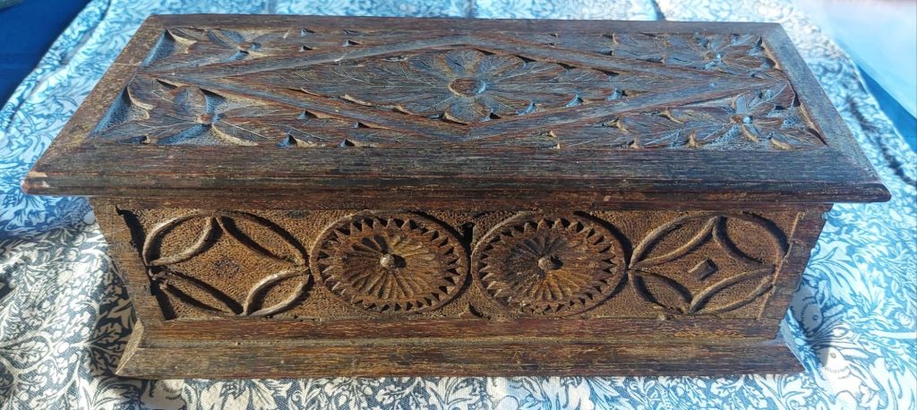 The #chipcarved English oak box (possibly Welsh made) is my latest acquisition. I do not0 have great knowledge in regard to this type of art/furniture, so speculation is required on my part. After researching boxes like this, I have come to the conclusion that it was created in the 17th/18th centuries. The lock is not original, neither are the hinges, and a person has added 6 screws on the base to hold the sides. I do not believe this box had a lock at all, and there were certainly no screws.