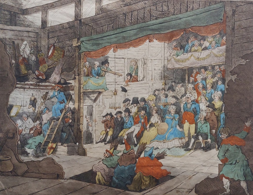 In my collection is an engraving created from a drawing by #WilliamHenryPyne. The engraving was created by #JohnWright in 1788. It portrays a scene from backstage at a theatre performance. Possibly a performance of Shakespeare’s “Macbeth” with the witches emerging from beneath the stage via a trap door.