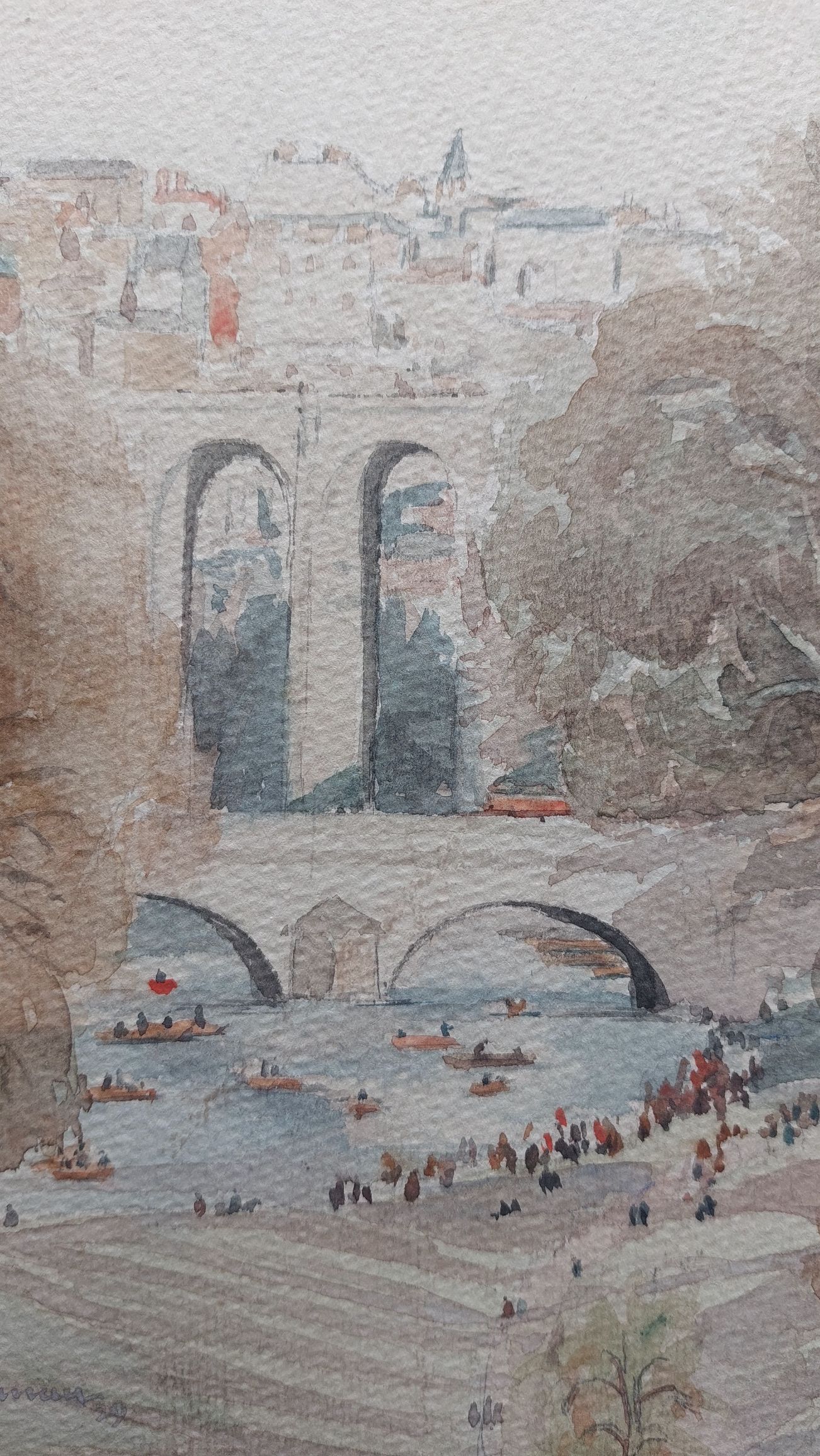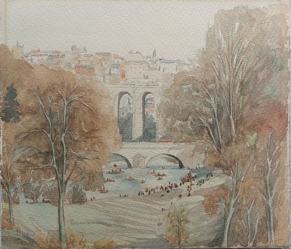 The painting displays a view of the town of #Knaresborough, as seen in 1929. Within it, we see the Viaduct, High Bridge, the #RiverNidd, and the town from a viewpoint on or near the Harrogate Ringway Trail. It is most likely summers’ day as seen by the numerous people paddling on the river as well as wading at the rivers edge.