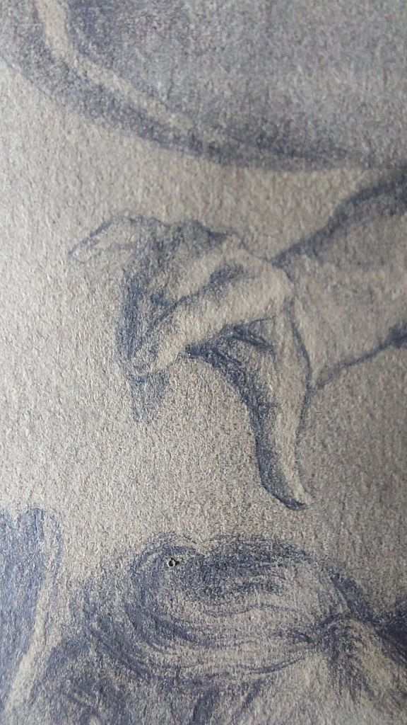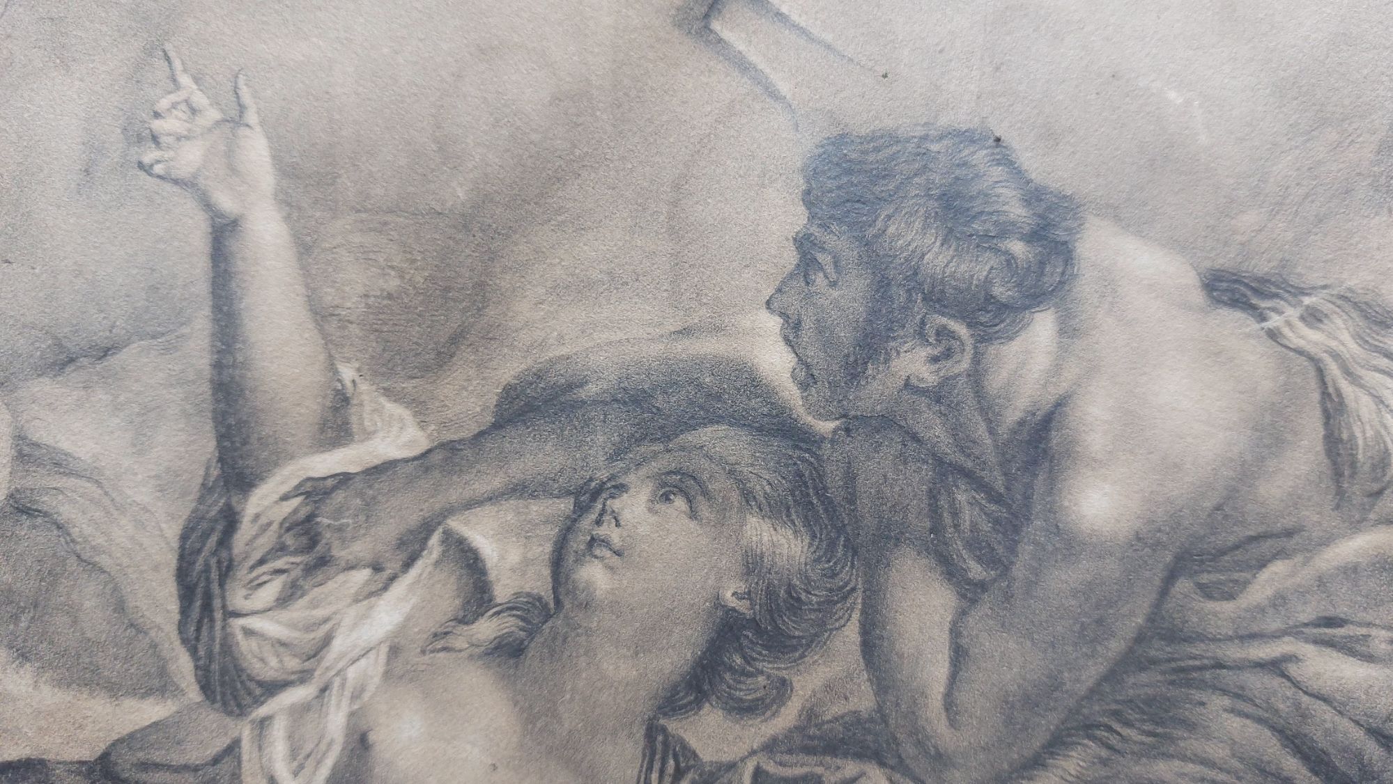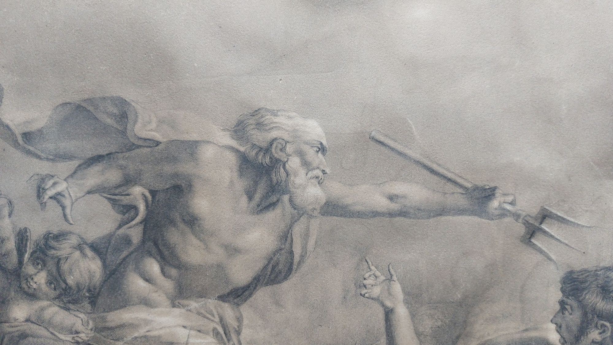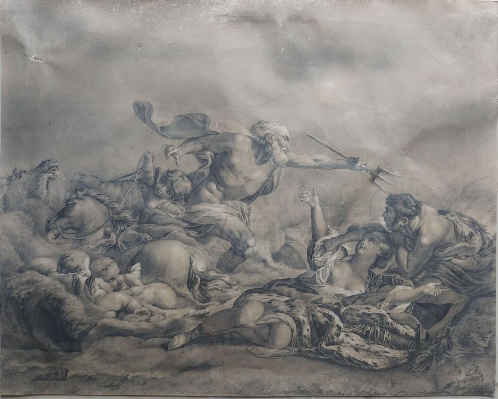 The artwork is actually a drawing. Black, brown, and white chalk (highlighting) with added graphite to add shimmer and definition. The image it displays is of Neptune saving Amymone from a satyr. At this point, I will say that it is a magnificent artwork.