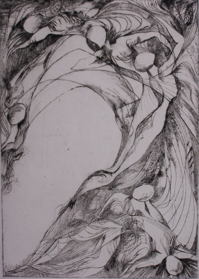 Surreal in representation and yet a surety of line which harkens to an earlier time. An interpretation of what the artist is seeing and his depiction is of what he is feeling- how these figures have moved him – are expressed here in line and colour. There is beauty here and to depths which we are privileged to see through an artists’ eye.
